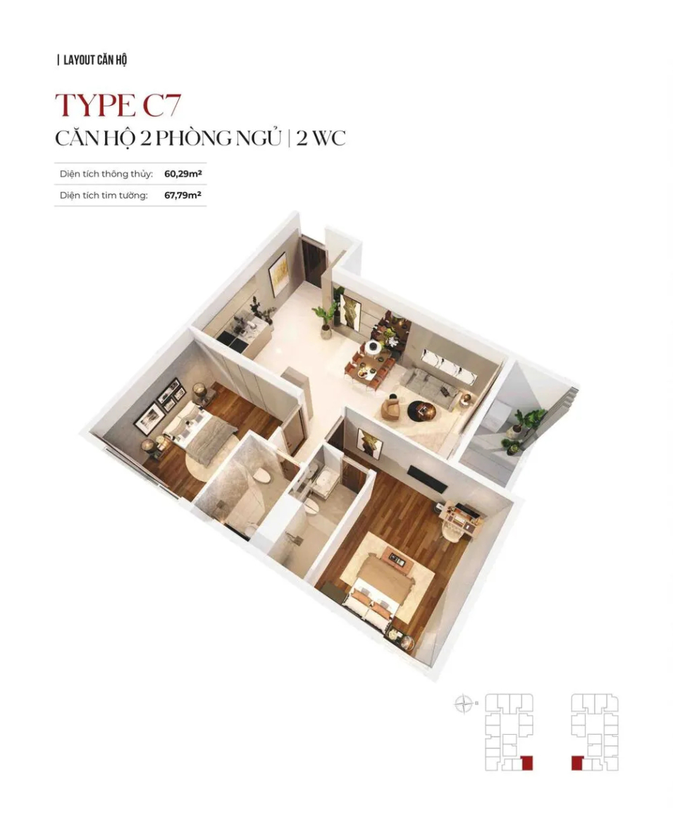 Căn hộ 2 PN | 63 -77 m2 | 2,6 – 3,7 tỷ đồng/căn |